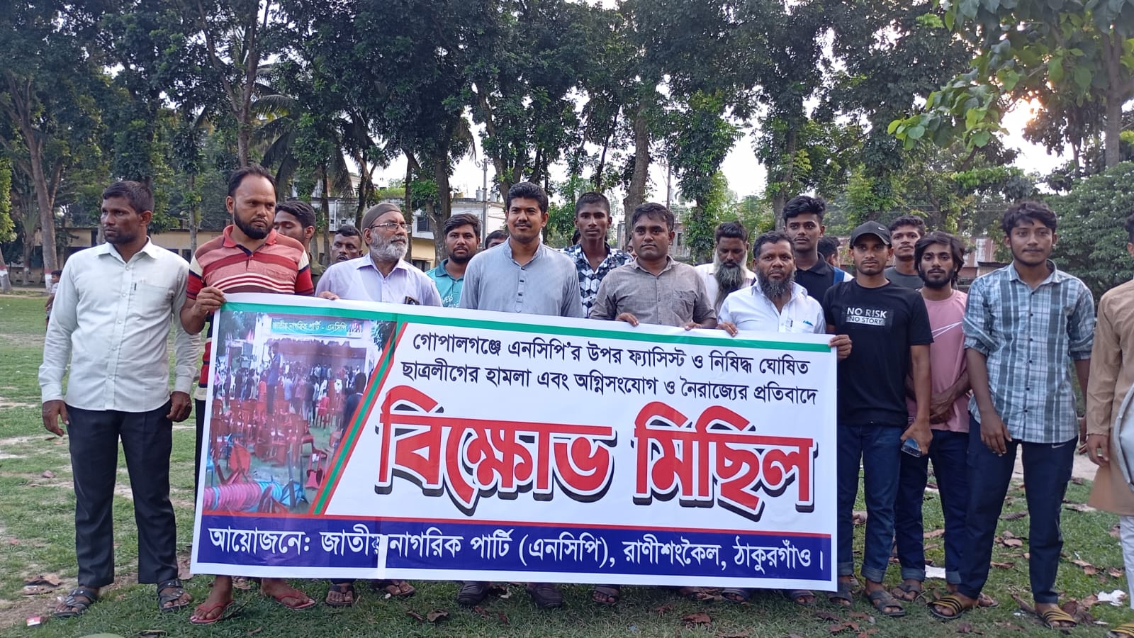 গোপালগঞ্জে জাতীয় নাগরিক পার্টি (এনসিপি)’র উপর নিষিদ্ধ ঘোষিত ছাত্রলীগের হামলার প্রতিবাদে জাতীয় নাগরিক পার্টি (এনসিপি) রাণীশংকৈল শাখার উদ্যোগে বিক্ষোভ মিছিল ও সমাবেশ অনুষ্ঠিত হয়েছে। বৃহস্পতিবার (১৭ জুলাই) বিকেলে রাণীশংকৈল ডিগ্রি কলেজ মাঠ থেকে বিক্ষোভ মিছিলটি বের হয়ে পৌর শহরের প্রধান সড়ক প্রদক্ষিণ করে বন্দর চৌরাস্তা মোড়ে গিয়ে এক সংক্ষিপ্ত আলোচনা সভা অনুষ্ঠিত হয়। এতে বক্তব্য রাখেন, জাতীয় নাগরিক পার্টি (এনসিপি)’র রাণীশংকৈল উপজেলার সংগঠক, মোকারম হোসেন সাদ্দাম, নূর নবী, শাহজান আলী , পিয়ারুল হোসেন ও জুলাই যোদ্ধা মো. হাবিব প্রমুখ।
