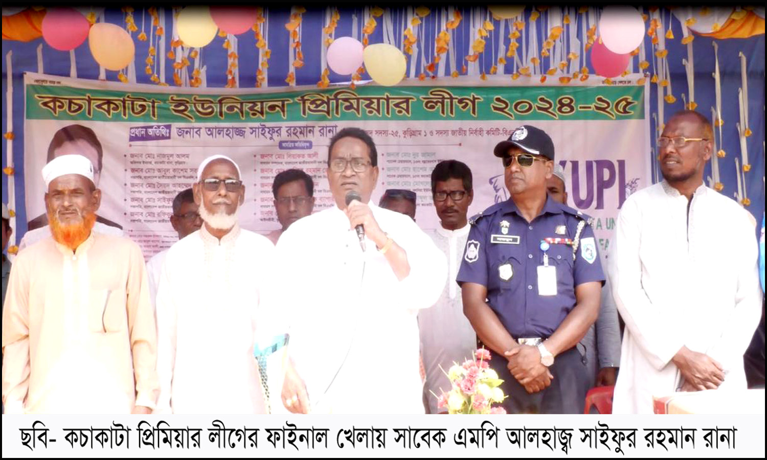 নূর-ই-আলম সিদ্দিক,নাগেশ্বরী (কুড়িগ্রাম) প্রতিনিধিঃ কুড়িগ্রামের প্রস্তাবিত কচাকাটা উপজেলার কচাকাটা ইউনিয়ন প্রিমিয়ার লীগ ২০২৪-২৫ এর জমকালো গ্র্যান্ড ফাইনাল খেলা অনুষ্ঠিত হয়েছে। কচাকাটা ইউনিয়ন ক্রীড়া সংঘের আয়োজন রবিবার (০৬ এপ্রিল) কচাকাটার নায়কের হাট ফুটবল মাঠে এ ফাইনাল খেলাটি অনুষ্ঠিত হয়। কচাকাটা ইউনিয়ন বিএনপি যুবদলের সাবেক সাধারণ সম্পাদক আব্দুল্লাহ আল মামুনের ব্যবস্থাপনা ও কচাকাটা ইউপি চেয়ারম্যান সাহাদৎ হোসেন মন্ডলের সভাপতিত্বে খেলায় প্রধান অতিথি হিসেবে উপস্থিত ছিলেন ছিলেন- কুড়িগ্রাম -১ আসনের সাবেক সাংসদ ও বিএনপির কেন্দ্রীয় নির্বাহী কমিটির সদস্য সাইফুর রহমান রানা। জমকালো এ ফাইনাল খেলাটিতে প্রতিদ্বন্দ্বী ভিতরবন্দ ইউনিয়নকে পরাজিত করে চ্যাম্পিয়ন ট্রফি অর্জন করে নারায়নপুর ইউনিয়ন পরিষদ।