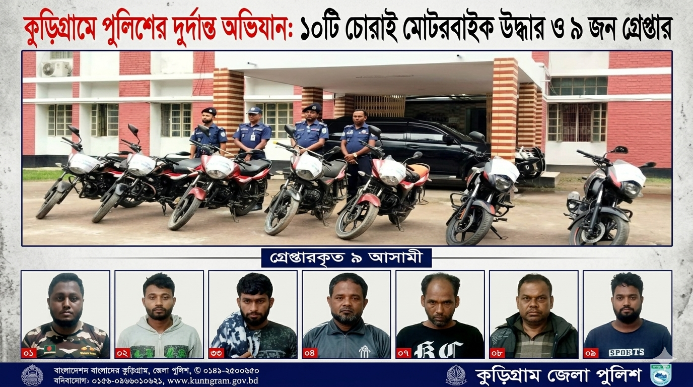কুড়িগ্রামে ১০টি চোরাই মোটর সাইকেল ও চোর চক্রের ৯ সদস্যকে গ্রেপ্তার করেছে পুলিশ। রবিবার (১৯ এপ্রিল) বিকেলে জেলা পুলিশ আয়োজিত এক সংবাদ সম্মেলনে এসব তথ্য জানানো হয়। পুলিশ জানায়, গত ডিসেম্বর ও জানুয়ারি মাসে কুড়িগ্রাম সদর এলাকার কোর্ট চত্বর, নিউরন ডায়াগনস্টিক সেন্টার, সদর হাসপাতাল ও জিয়া বাজার এলাকা থেকে চারটি মোটরসাইকেল চুরি যায়। এরমধ্যে ১৭ জানুয়ারি সন্ধ্যায় সদর উপজেলার হাসপাতাল পাড়া এলাকার নিউরন ডায়াগনস্টিক সেন্টার থেকে একটি টিভিএস অ্যাপাচি ১৬০ সিসি মোটর সাইকেল চুরির ঘটনায় মামলা দায়ের করা হয়। ঘটনার পর পুলিশ সিসিটিভি ফুটেজ ও তথ্যপ্রযুক্তির সহায়তায় চোরচক্রের সদস্যদের শনাক্ত করে। পরে অভিযান চালিয়ে গাজীপুরের কাশিমপুর এলাকা থেকে শাহজামাল ওরফে বাবু ও নুর ইসলামকে একটি চোরাই মোটর সাইকেলসহ গ্রেপ্তার করা হয়। পরে তাদের দেওয়া তথ্যের ভিত্তিতে লালমনিরহাট, উলিপুর, নাগেশ্বরী ও ফুলবাড়ীসহ বিভিন্ন এলাকা থেকে আরও ৭ জনকে গ্রেফতার করা হয়। গ্রেপ্তারকৃতরা হলেন- রাজারহাট উপজেলার বদ্দের বাজারের শাহজামাল ওরফে বাবু মিয়া, জামালপুর সদরের নারায়নপুরের নুর ইসলাম, উলিপুর উপজেলার জানজায়গীর এলাকার খাইরুল ইসলাম বাবু, নাগেশ্বরী উপজেলার দক্ষিণ ব্যাপারীরহাটের রেজাউল হাসান ওরফে বারেক, নাগেশ্বরীর কুটি পয়রাডাঙ্গার রফিকুল ইসলাম, লালমনিরহাটের বড়বাড়ি শিবরাম এলাকার মিটুল মিয়া ওরফে পাশা, ফুলবাড়ী উপজেলার ছিট রাবাইতাড়ি খায়রুল আলম, নাগেশ্বরী পৌরসভার গোদ্দারপাড়ের আজিজুল হক ও লালমনিরহাটের বনগ্রাম কুলাঘাট এলাকার আনিছুর রহমান। পুলিশ জানায়, চক্রটি দেশের বিভিন্ন জেলা ও উপজেলায় মোটর সাইকেল চুরি করে কম দামে বিক্রি করত। পরে ভুয়া কাগজপত্র তৈরি করে সেগুলো বেশি দামে সাধারণ মানুষের কাছে বিক্রি করতো। এ ঘটনায় গ্রেপ্তারকৃত কয়েকজন আদালতে ১৬৪ ধারায় স্বীকারোক্তিমূলক জবানবন্দি দিয়েছেন। উদ্ধার হওয়া ১০টি মোটর সাইকেলের মধ্যে দুটির মালিকানা শনাক্ত করে সংশ্লিষ্ট মামলার তদন্ত কর্মকর্তার কাছে হস্তান্তর করা হয়েছে। আরও একটি মোটরসাইকেল মাদকদ্রব্য নিয়ন্ত্রণ অধিদপ্তরের হেফাজতে রয়েছে। যা আদালতের নির্দেশে মালিককে ফেরত দেওয়া হবে। বাকি সাতটি মোটর সাইকেল কুড়িগ্রাম থানা হেফাজতে রয়েছে এবং সেগুলোর মালিকানা যাচাই চলছে। এ ঘটনায় কুড়িগ্রাম থানায় দুটি, লালমনিরহাট সদর থানায় একটি এবং রাজারহাট থানায় একটি মামলা দায়ের হয়েছে বলে জানায় পুলিশ। এ বিষয়ে কুড়িগ্রাম পুলিশ সুপার খন্দকার ফজলে রাব্বি বলেন, চোরচক্র দমনে জেলা পুলিশের নিয়মিত অভিযান অব্যাহত রয়েছে। তথ্যপ্রযুক্তির সহায়তায় অপরাধীদের দ্রুত শনাক্ত করে আইনের আওতায় আনা হচ্ছে। জনগণের 