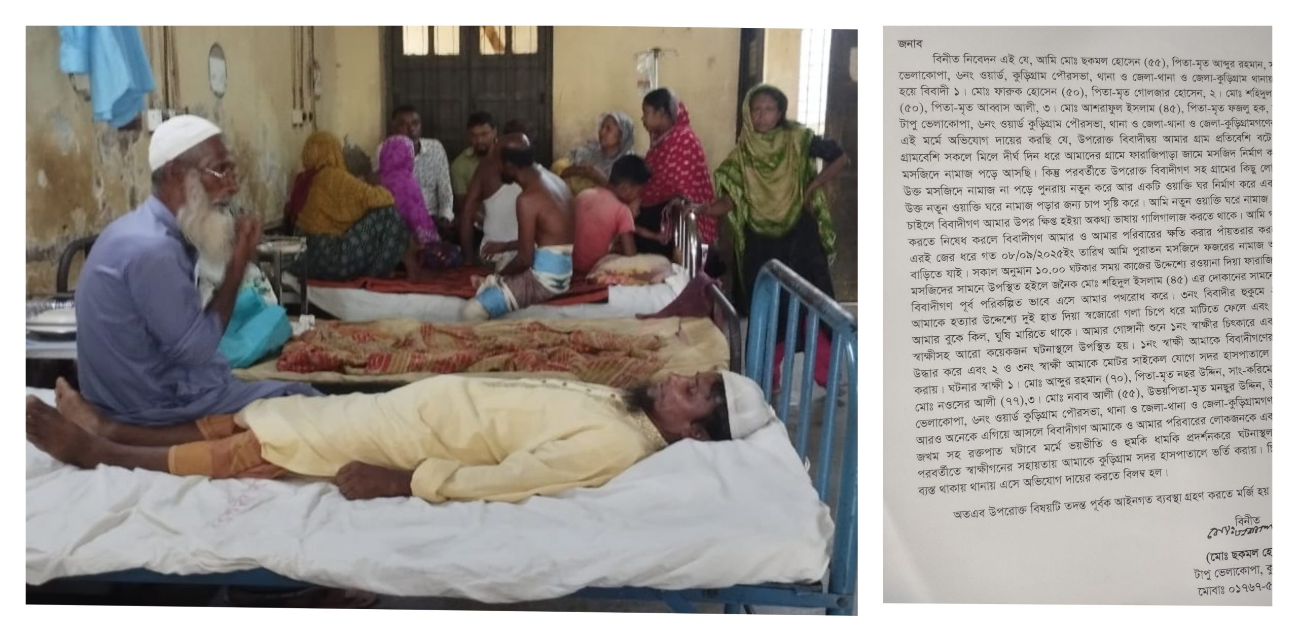 অভিযোগ সুত্র ও স্থানীয়দের সাথে কথা বলে জানা যায়, টাপু নামা ভেলাকোপা এলাকায় গ্রামের সকলে মিলে ফারাজিপাড়া জামে মসজিদ নির্মান করেন। উক্ত মসজিদে সবাই নিয়মিতভাবে নামাজ আদায় করে আসছিলেন। কিন্তু গ্রামের কিছু লোকজন উক্ত মসজিদে নামাজ আদায় না করে পুনরায় নতুন করে আর একটি ওয়াক্তি ঘর নির্মাণ করেন। পরে ওয়াক্তি ঘরে নামাজ আদায় করার জন্য তারা চাপ সৃষ্টি করতে থাকেন। ঘটনার দিন নতুন ওয়াক্তি ঘরে নামাজ পড়তে না চাইলে বিবাদীগণ ছকমল হোসেনের উপর ক্ষিপ্ত হয়ে অকথ্য ভাষায় গালিগালাজ করতে থাকে।এক পর্যায়ে ভুক্তভোগী ছকমলের উপর মারধর ও গলা টিপে হত্যা চেষ্টা চালায়। পরে স্থানীয়রা ছকমলকে উদ্ধার করে চিকিৎসার জন্য সদর হাসপাতালে ভর্তি করায়। এ ঘটনায় সুষ্ঠু বিচার দাবি করেছেন ভুক্তভোগীসহ স্থানীয় লোকজন।