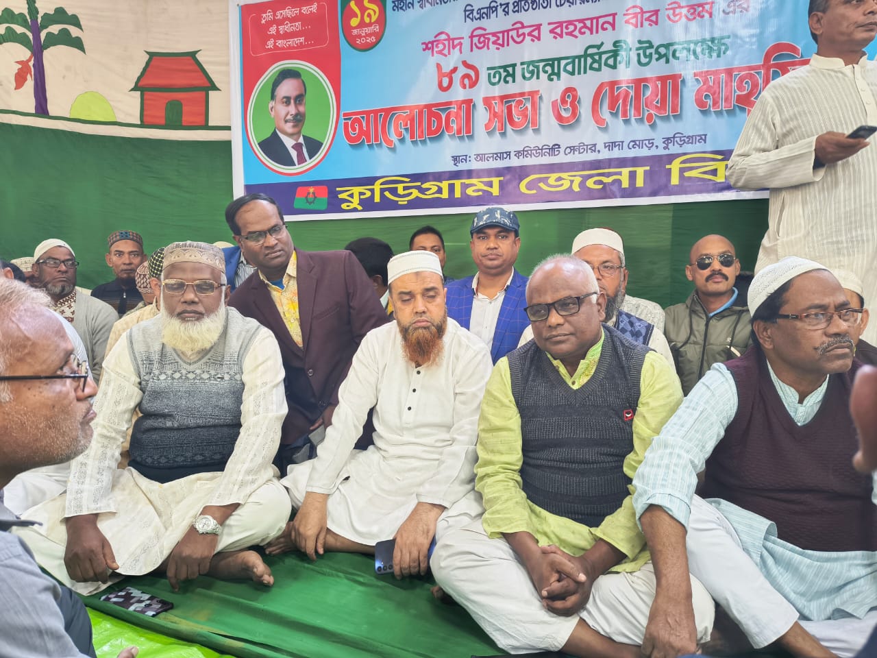 মহান স্বাধীনতার ঘোষক,বিএনপির প্রতিষ্ঠাতা শহীদ প্রেসিডেন্ট জিয়াউর রহমান বীর উত্তম এর ৮৯ তম জন্মবার্ষিকী নানা আয়োজনে পালন করেছে কুড়িগ্রাম জেলা বিএনপি। সকালে দলীয় পতাকা উত্তোলন ও পরে দুপুরে দাদামোড়ে আলমাস কমিউনিটি সেন্টারে আলোচনাসভা ও দোয়ামাহফিল অনুষ্ঠিত হয়।কুড়িগ্রাম জেলা বিএনপির আহবায়ক মোস্তাফিজার রহমান মোস্তফার সভাপতিত্বে আলোচনাসভায় বক্তব্য রাখেন জেলা বিএনপির সদস্যসচিব সোহেল হোসনাইন কায়কোবাদ,সিনিয়র যুগ্ম আহবায়ক অধ্যাপক শফিকুল ইসলাম বেবু,যুগ্ম আহবায়ক ,সাংবাদিক হাসিবুর রহমান হাসিব,কুড়িগ্রাম জেলা বিএনপির সাবেক যুগ্ম সম্পাদক আশরাফুল হক রুবেল,জেলা বিএনপির সাবেক সাধারণ সম্পাদক উমর ফারুক,সাবেক উপজেলা বিএনপি সভাপতি আব্দুল আজিজ,সাবেক সাংগঠনিক সম্পাদক সহিরুজ্জামান সাজু,সাবেক উপজেলা বিএনপির সাধারণ সম্পাদক মাহবুব হোসেন,সাবেক সাধারণ সম্পাদক পৌর বিএনপি মহিউদ্দিন জাহাঙ্গির,জেলা বিএনপির সাবেক সদস্য আজিজুল হক,জেলা যুবদল সভাপতি রায়হান কবির,জেলা স্বেচ্ছাসেবকদলের আহবায়ক ওয়াহেদ রানা,কৃষকদলের আহবায়ক রিপন রহমান,জেলা ছাত্রদল সভাপতি আমিমুল ইহসান,জেলা জাসাস আহবায়ক সজীব,মৎস্যদলের মহুবর রহমান সহ নেতৃবৃন্দ। এ সময় বক্তারা শহীদ রাষ্ট্রপতি জিয়াউর রহমানের নীতি ও আদর্শকে সামনে রেখে সাজ বির্নিমানে সকল নেতা কর্মীকে কাজ করার আহবান জানান।