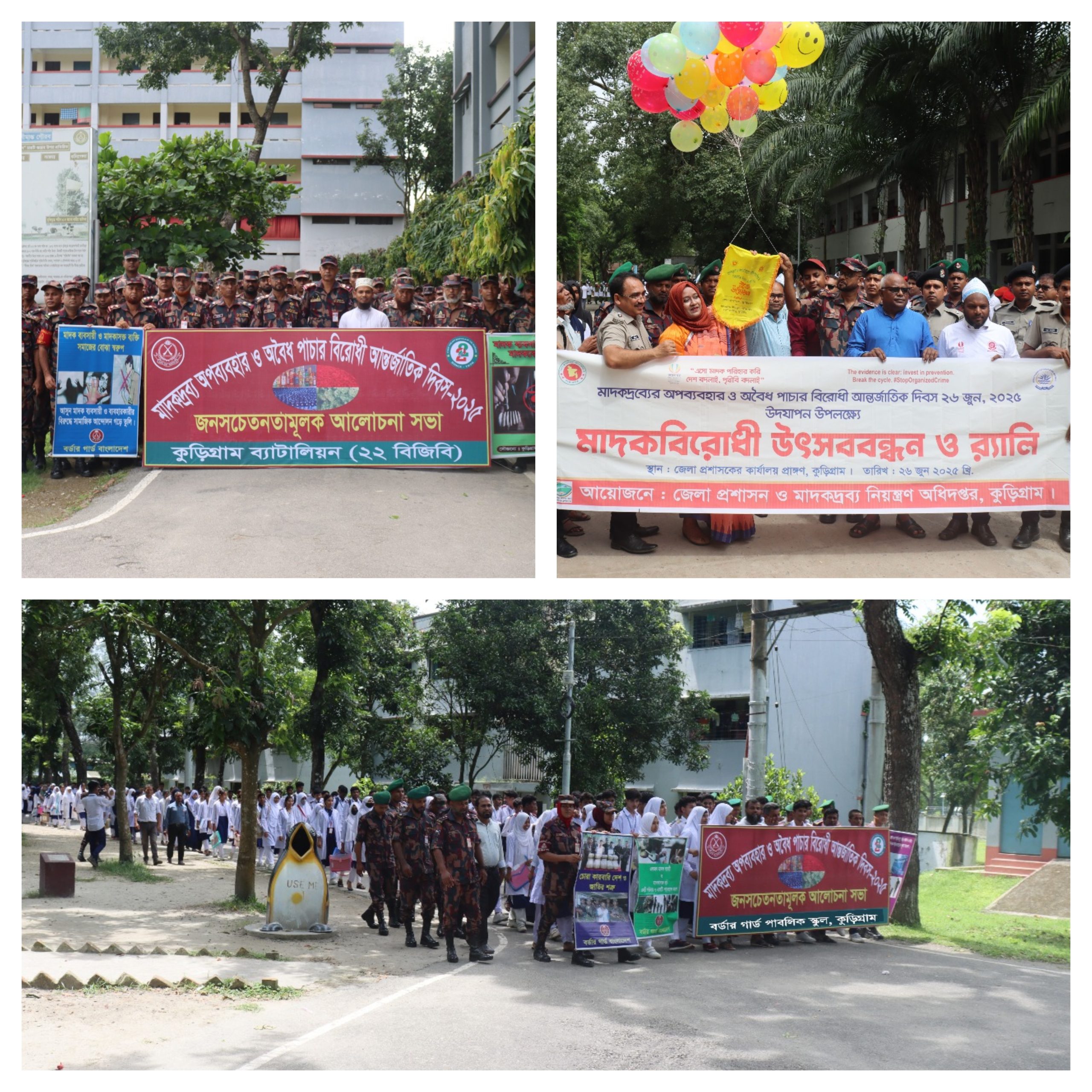 বিজিবি সূত্র জানায়, গত ২০ থেকে ২৮ জুন পর্যন্ত কুড়িগ্রাম ব্যাটালিয়ন (২২ বিজিবি) তাদের কর্ম এলাকায় মাদকদ্রব্যের অপব্যবহার রোধে জনসচেতনতা বাড়াতে ব্যানার, ফেষ্টুন এবং পোস্টার প্রদর্শনের মাধ্যমে বিভিন্ন বার্তা প্রদান করা হয়। বিশেষ করে সীমান্ত এলাকা যাত্রাপুরের চাকেন্দাখান পাড়া উচ্চ বিদ্যালয়ের মাঠ, নারায়নপুর বিওপিতে নারায়ণপুর সরকারি প্রাথমিক বিদ্যালয় মাঠ, পাথরডুবি, ময়দান, দিয়াডাংগা, ধলডাংগা, উত্তর ধলডাংগা, হাজিপাড়া, শালঝোড়, ভাওয়ালকুড়ি, বাবুরহাট, সোনাহাট, কেদার, কচাকাটা,মাদারগঞ্জ, চৌদ্দঘুড়ি, পাখিউড়ার চর, দই খাওয়ারচর এলাকায় স্থানীয় গণ্যমান্য ব্যক্তিবর্গ, স্বেচ্ছাসেবী ও এলাকার সাধারণ জনগণের উপস্থিতিতে মাদকদ্রব্য অপব্যবহার ও অবৈধ পাচারবিরোধী বিষয়ে জনসচেতনতামূলক সভা আয়োজন করা হয়।