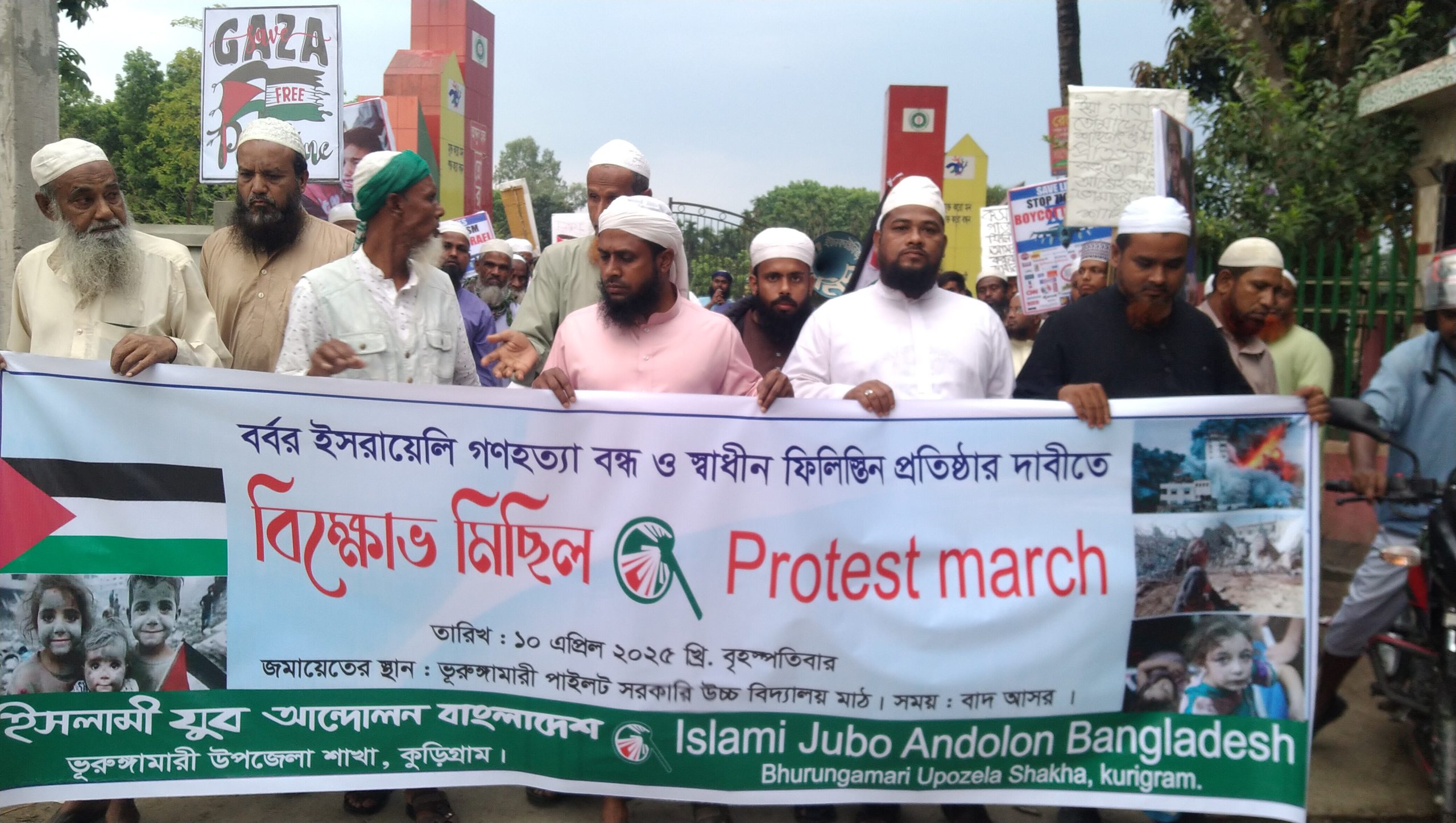 বৃহস্পতিবার (১০এপ্রিল) বাদ আসর ভূরুঙ্গামারী  সরকারি পাইলট উচ্চ বিদ্যালয়  প্রাঙ্গণ  হতে বিক্ষোভ মিছিল ও প্রতিবাদ সমাবেশ অনুষ্ঠিত হয়। উপজেলার বিভিন্ন সড়ক প্রদক্ষিণ করে উপজেলার প্রাণকেন্দ্র জামতলা মোড় এসে শেষ হয়।