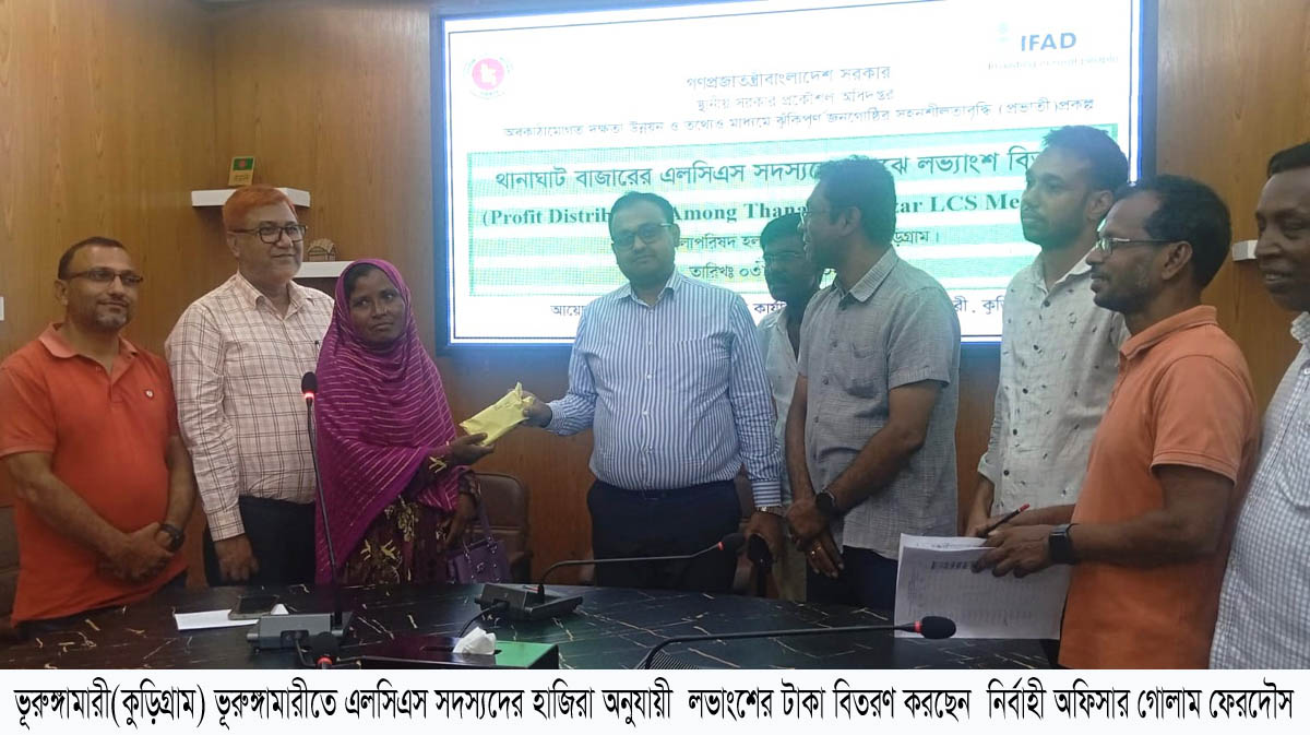 ভূরুঙ্গামারীতে স্থানীয় সরকার প্রকৌশল অধিদপ্তরের অধীন “অবকাঠামোগত দক্ষতা উন্নয়ন ও তথ্যের মাধ্যমে ঝুঁকিপূর্ণ জনগোষ্ঠির সহশীলতা বৃদ্ধি(প্রভাতী)” প্রকল্প এলসিএস সদস্যদের হাজিরা অনুযায়ী লভাংশের টাকা বিতরণ করা হয়েছে।
