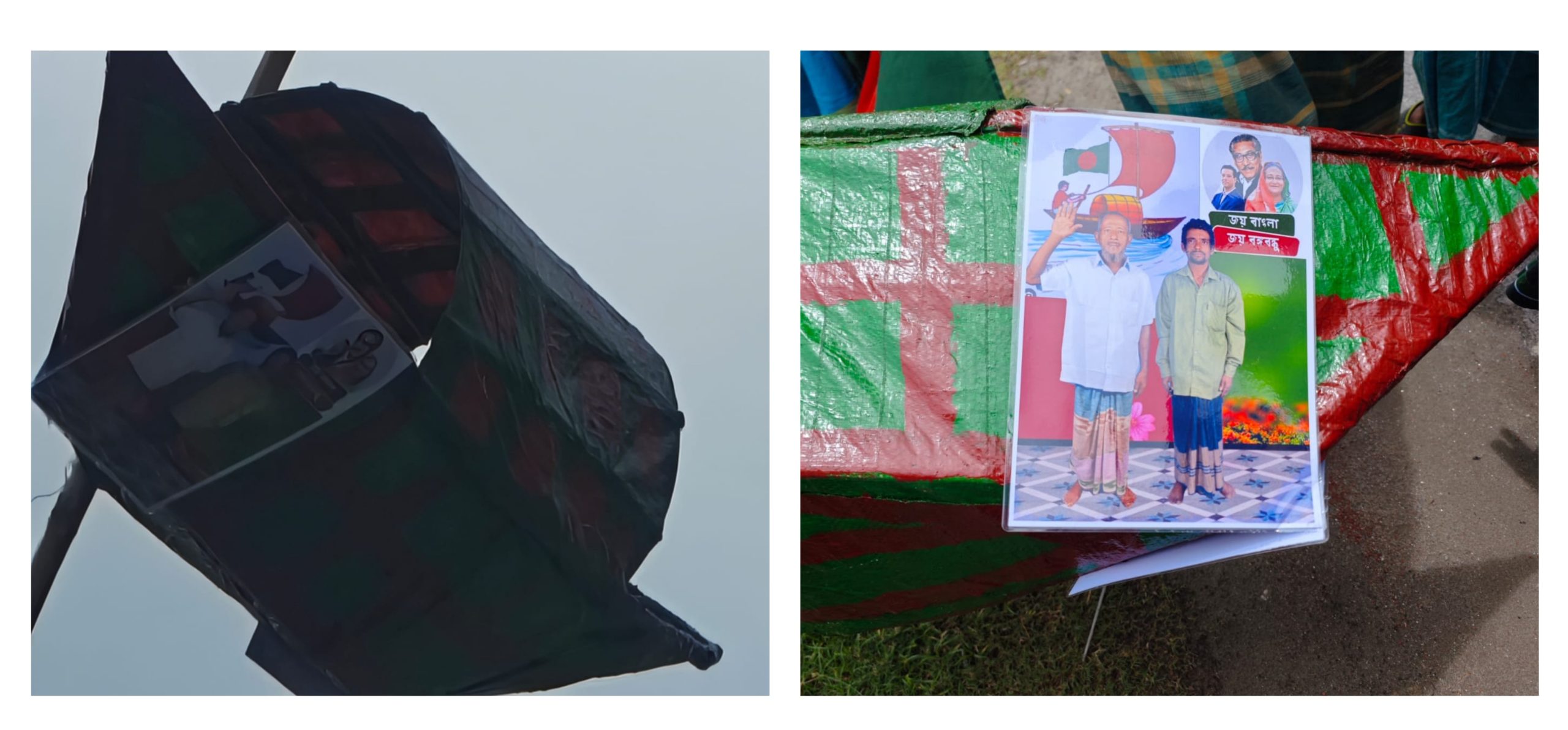 এলাকাবাসী জানান, বৃহস্পতিবার গভীর রাতে কুড়ার পাড় বাজারে বাঁশ ও কাপড় দ্বারা তৈরি একটি নৌকা বাঁশের আগায় ঝুলিয়ে রাখে ওই এলাকার মৃত আব্দুস সামাদ এর ছেলে বারেক (৫৫) ও মৃত আকাব আলীর ছেলে ময়নাল হক (৩৫)। এবং নৌকার সাথে নিজেদের ছবি ও “জয় বাংলা, জয় বঙ্গবন্ধু ” লেখা স্লোগান ডিজিটাল ব্যানারে প্রিন্ট করে লাগিয়ে দেয়। তারা দুজনেই আওয়ামীলীগের কর্মী।