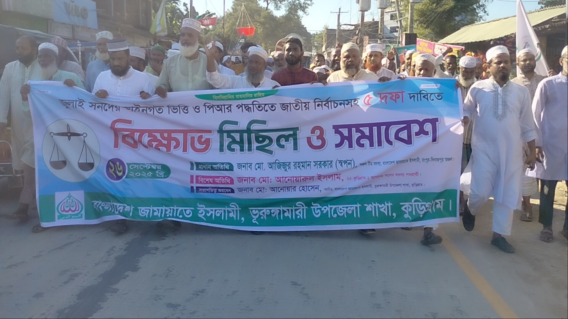 আগামী ফেব্রুয়ারিতে জুলাই সনদের ভিত্তিতে জাতীয় নির্বাচন অনুষ্ঠানসহ কেন্দ্র ঘোষিত ৫-দফা দাবিতে কুড়িগ্রামের ভূরুঙ্গামারীতে বিক্ষোভ মিছিল করেছে বাংলাদেশ জামায়াতে ইসলামী।