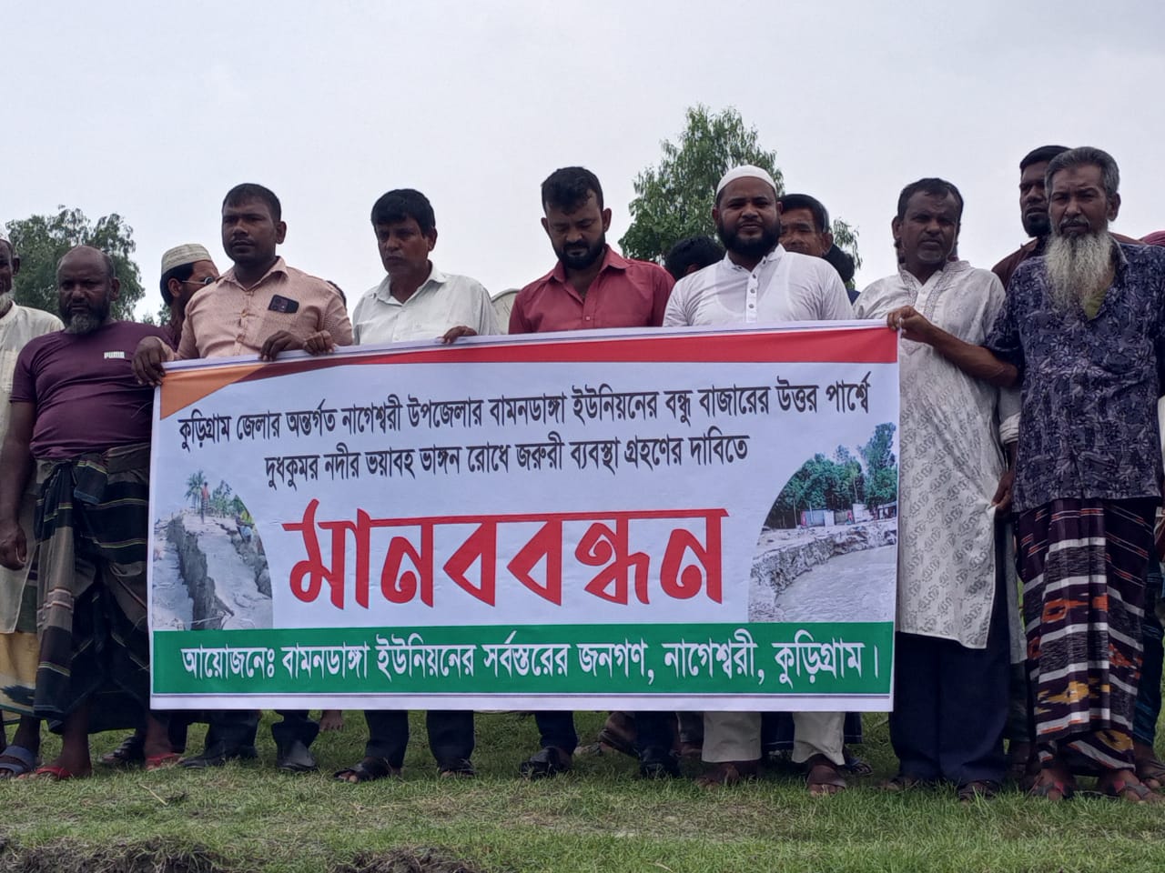 কুড়িগ্রামের নাগেশ্বরী উপজেলার বামনডাঙ্গা ইউনিয়নের কুটির চরে দুধকুমর নদীর ভয়াবহ ভাঙন রোধে মানববন্ধন কর্মসূচি পালিত হয়েছে। বুধবার (১০ সেপ্টেম্বর) সকাল ১১টায় বামনডাঙ্গা ইউনিয়ন বিএনপির উদ্যোগে এ মানববন্ধনের আয়োজন করা হয়।